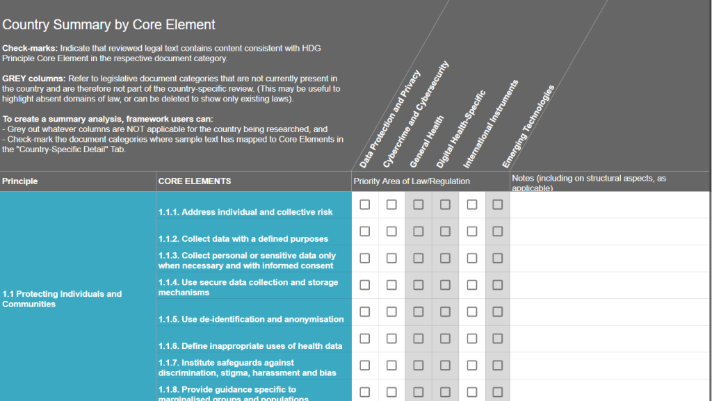 This tool supports document-based reviews of legal and regulatory landscapes pertaining to health data governance. The template helps link the Core Elements of the Health Data Governance Principles (HDG Principles), the principles’ most detailed level, to sample text demonstrating how, and to what extent, the principles are represented in legislative and regulatory documents. This tool is meant to be used for single-country inquiries.
