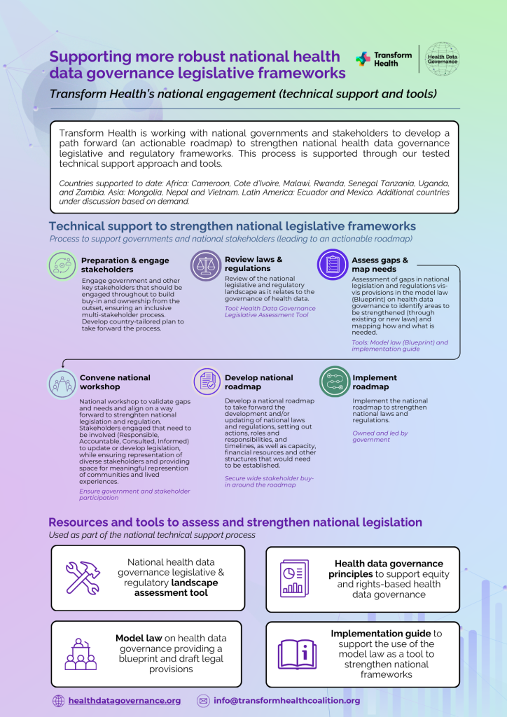 Transform Health is working with partners at national, regional and global levels to advocate for and support more robust health data governance, including: